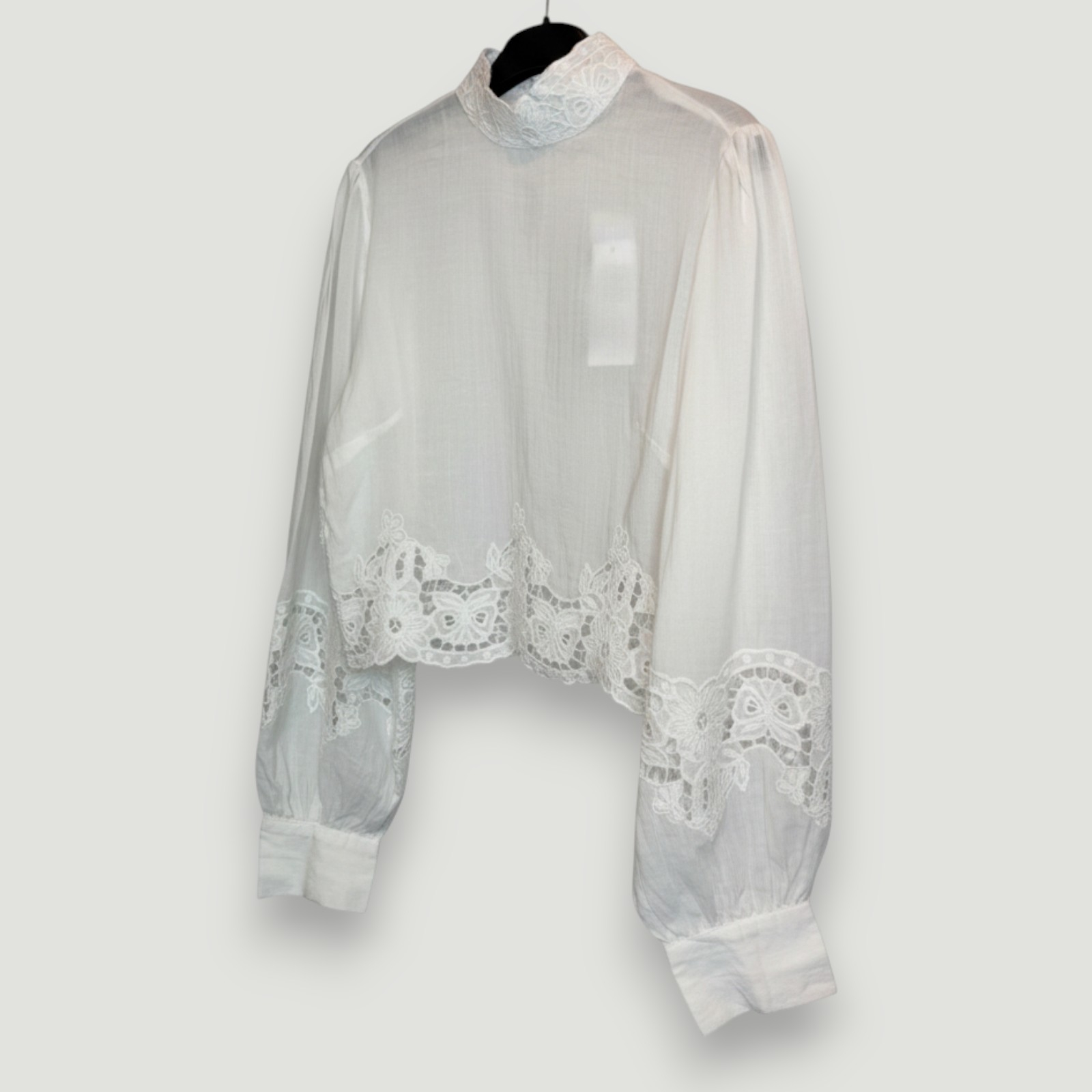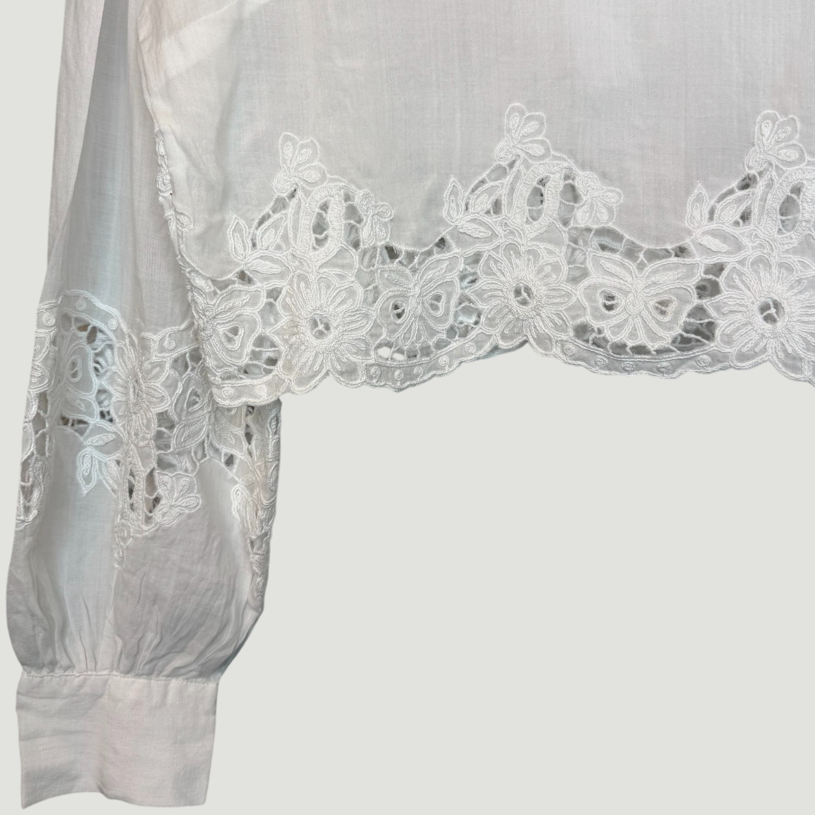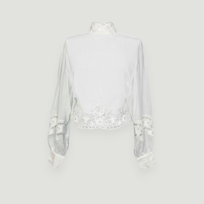 - Culoare: Alb, Detalii: dantelă florală brodată la tiv, mâneci și guler
