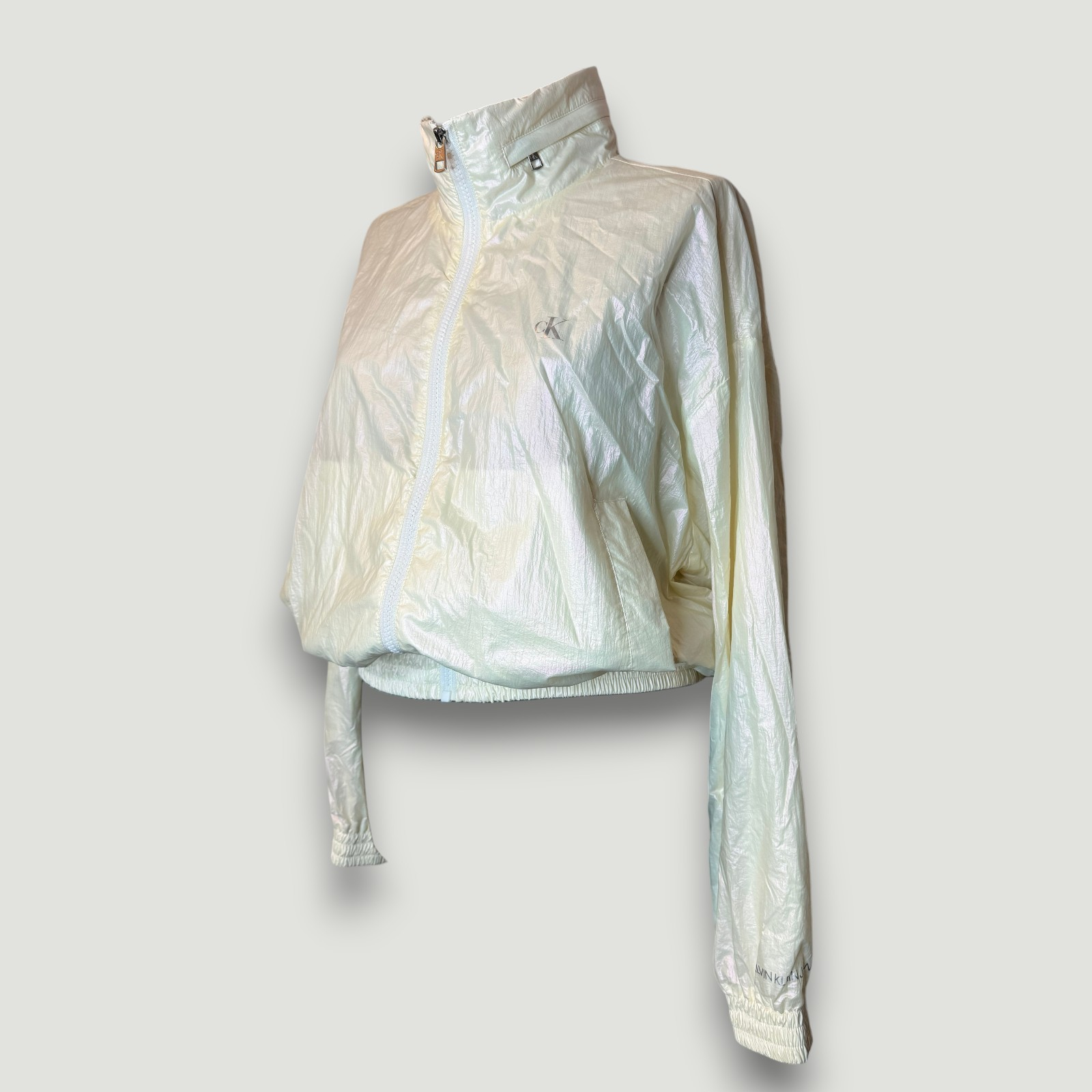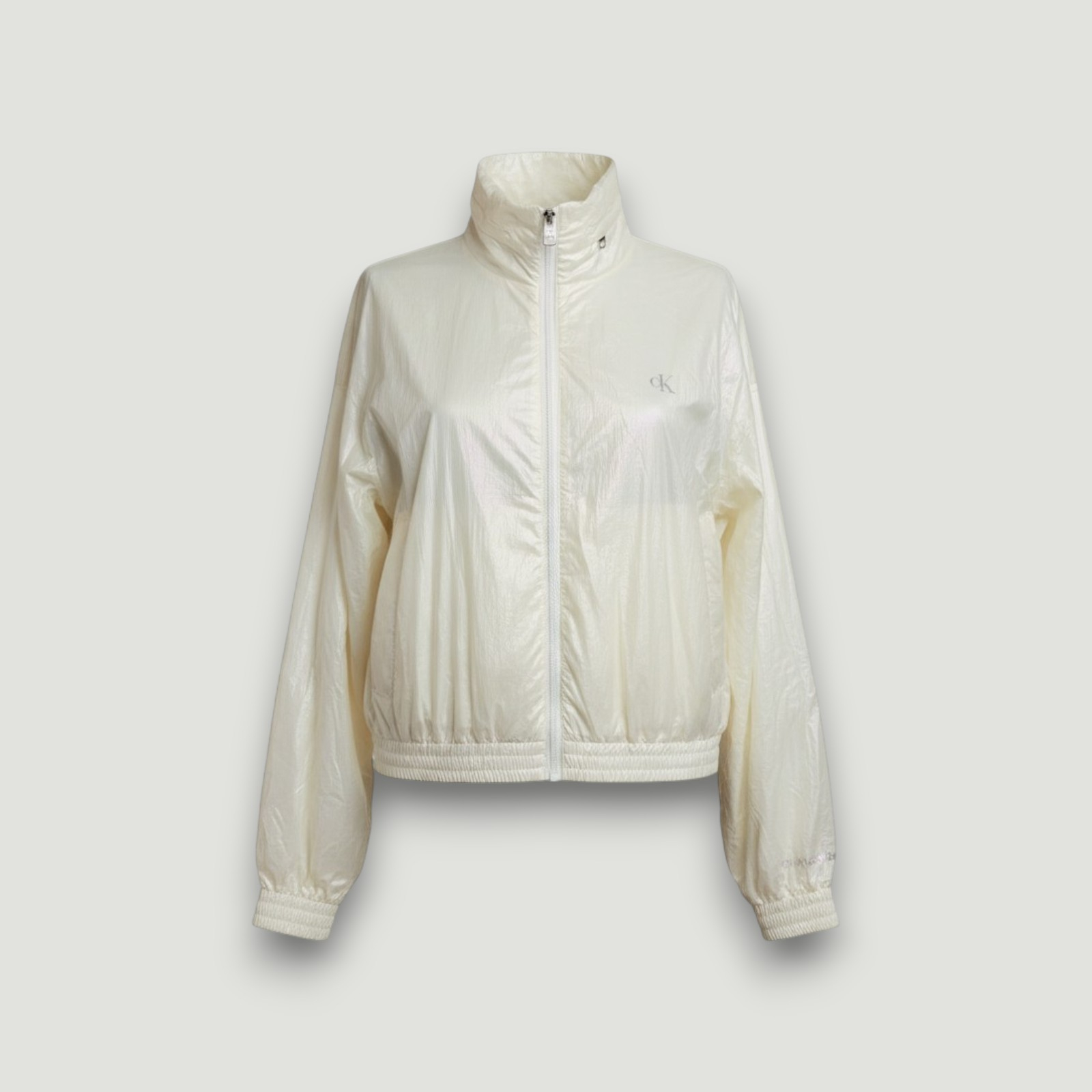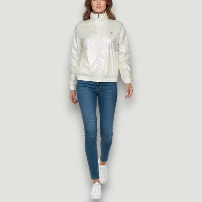Geacă Calvin Klein într-o nuanță alb-ivory cu efect irizat, perfectă pentru un look fresh, modern și effortless cool. Materialul ușor, cu aspect lucios, oferă un vibe sporty-chic, ideal pentru sezonul de tranziție sau serile răcoroase.